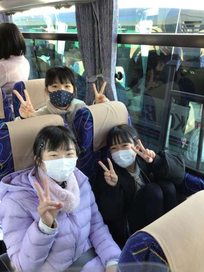 待ちに待った修学旅行の日がやってきました。晴天の中、みんな元気に出発しました。バスの中ではガイドさんの話をしっかり聞いたり、友だちと静かにおしゃべりしたりして過ごしています。素敵な旅の始まりです!
