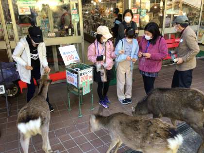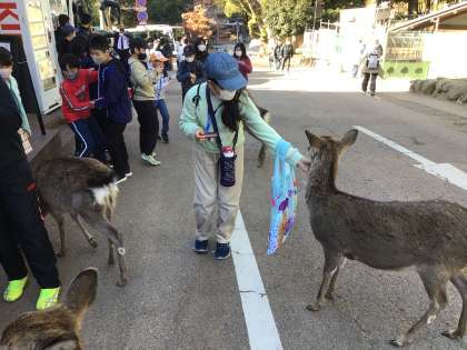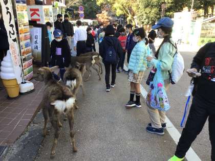 鹿せんべいを買っている子もいます。鹿せんべいを持っていると鹿がたくさん寄ってきます。オスの角を切った後なので、安心して鹿せんべいをあげています。