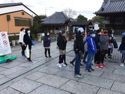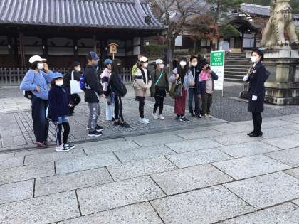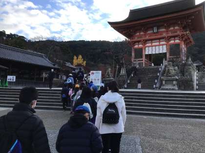 清水寺のに仁王門の前まで来ました。仁王門の説明を静かに聞いています。