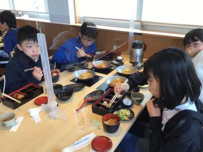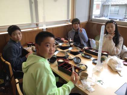 タクシー班別学習から戻ってきました。レストラン嵐山で昼食を食べています。