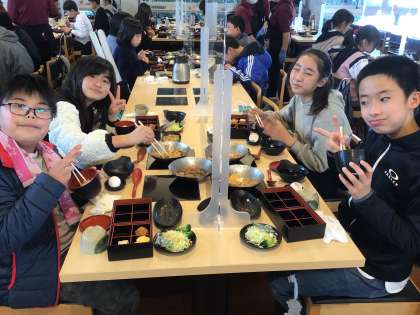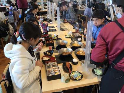 メニューは、カツ膳です。ここでも美味しくいただきました。班ごとに席につき楽しそうに食べていました。