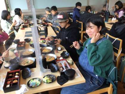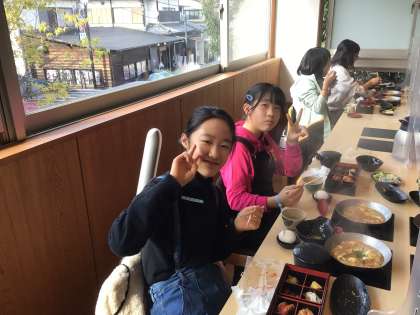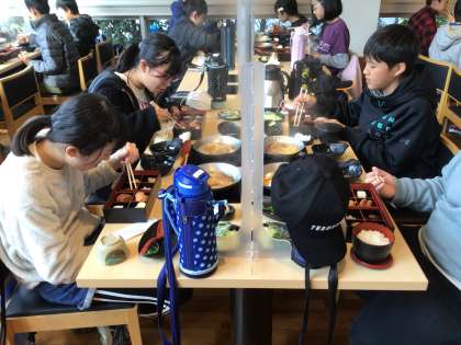 食事が終わった班から、ごちそうさまをして、1階のお土産売り場に行き、お土産を買いました。家族や親戚の方へのお土産を真剣に選んでいました。2千円ごとに1回できるガチャガチャでも盛り上がっていました。