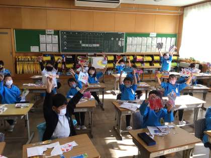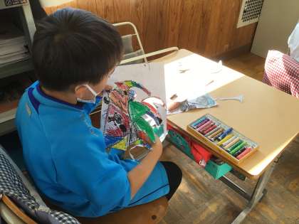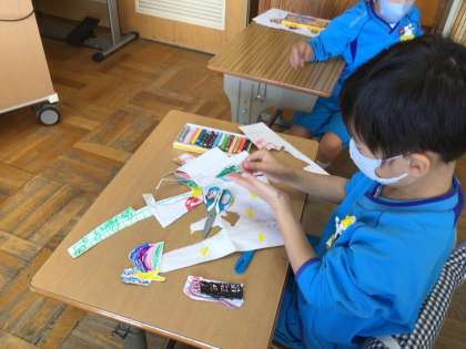 切れた乗り物をもって、「見てみて〜」と。とっても、上手に切れました。