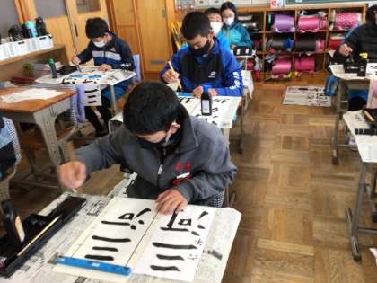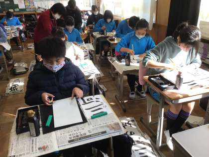 本日の書写の授業です。今日は、書写ボランティアさんによる授業でした。書き初めの練習でした。今年は、「三河の城」です。初めに、上手にかくために大切なことを教えていただきました。