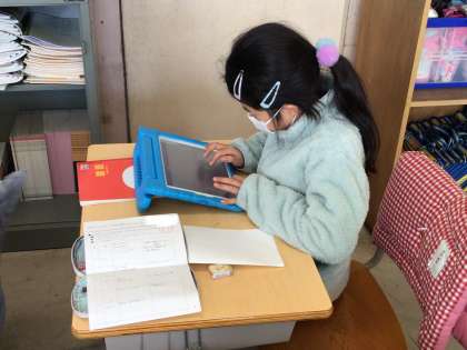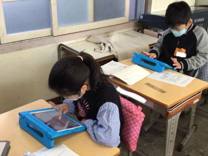 「想ぞうを広げて物語を書こう」で、タブレットを使って物語を書いています。手直しが簡単で、タブレットは便利ですね。