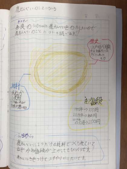 6年生の自主学習ノートの進め方です。疑問に思ったことをまとめています。また、来年、中学生になるので、授業の予習をしています。さらに、修学旅行で興味をもった鹿せんべいについて調べてあります。振り返りをしっかり書いてあるところも立派です。