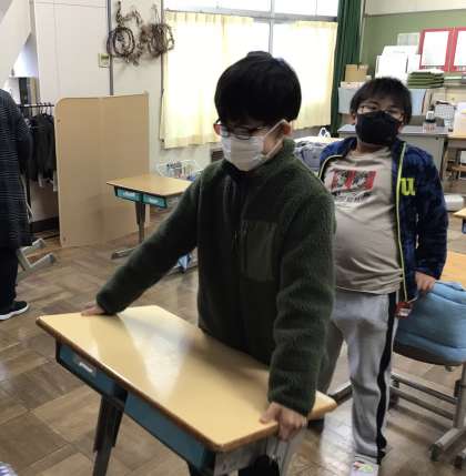 本日の掃除の様子です。さすが6年生にもなると、机をしっかり持ち上げて運んでいました。1年生は、床を雑巾できれいに拭いていました。