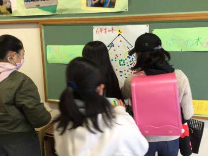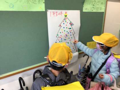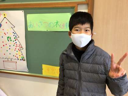 元気よく挨拶ができた子は、シールを1枚もらいます。そのシールをあいさつの木に貼っています。
