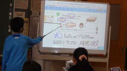 算数では、自分たちで考え、説明する力を大切に取り組んでいます。写真は、考え方をみんなに説明しています。