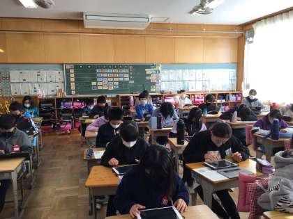 今日は、浄水中学校の1年生がSDGsについて作成した動画を見ました。その動画を見た後に、学習用タブレットを使ってアンケートとクイズに答えました。SDGsに興味をもった6年生も多くいました。