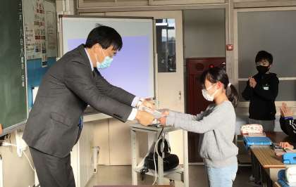夏休みの応募作品で優秀な成績を収め、校長先生から賞状を授与していただきました。今後も、進んで作品を応募してくださいね。