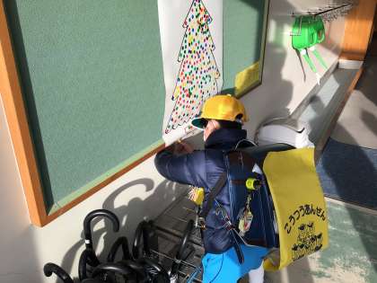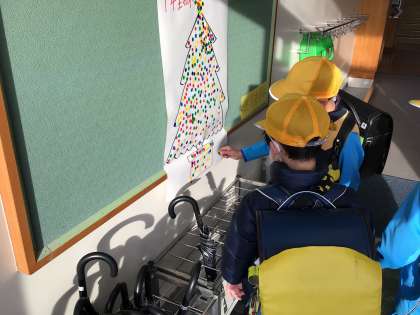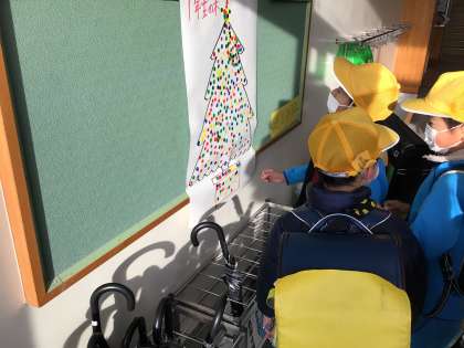 元気よくあいさつ出来た1年生が、シールを貼っていました。