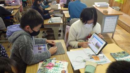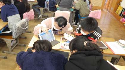 1組での話し合いの様子です。学習用タブレットを上手に使いながら、話し合いを進めています。