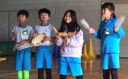 音楽で学習した曲に合わせて演奏をしたグループもありました。
