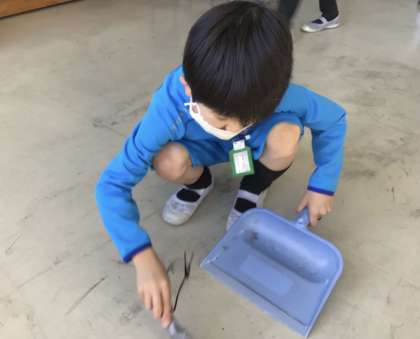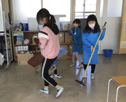 1年生の教室と低学年多目的室の掃除です。1年生と6年生が協力して教室をきれいにしています。