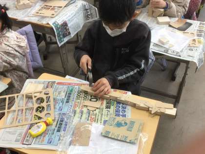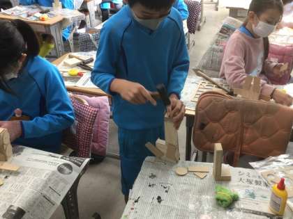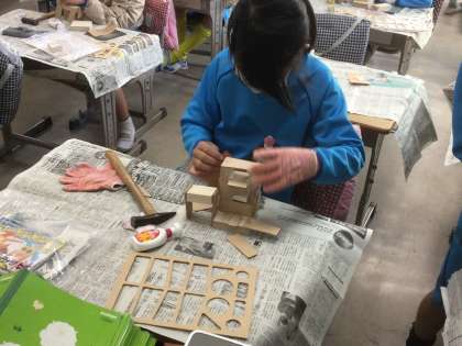 木を釘やボンドでつなげて作品を作っています。中にはほぼつなげ終わり、やすりがけなど仕上げに入る児童が出てきました。