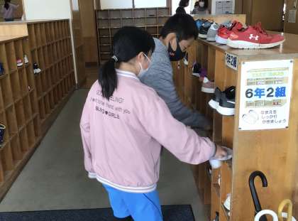 東昇降口の掃除です。毎日、ミニほうきで一つ一つの靴箱の砂を集めてきれいにしています。また、1年生の靴箱を1年生と一緒にきれいにしています。