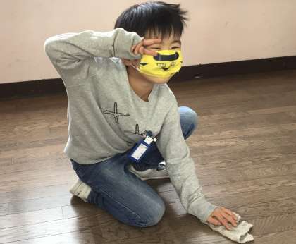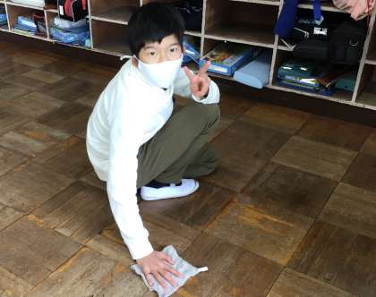 今日の掃除の様子です。廊下や教室の床を雑巾でていねいに拭いてきれいにしていました。元気もよかったです。