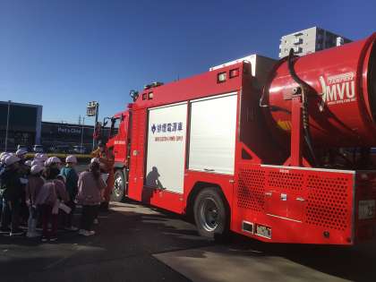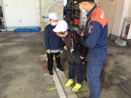 1・2組、消防署のつづきです。様々な種類の消防車について教えていただいたり、消火の時に背負うボンベを背負わせていただいたりと、学校では学べないことを学ぶことができ、子どもたちも嬉しそうです。