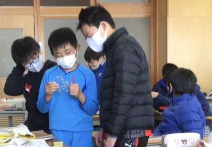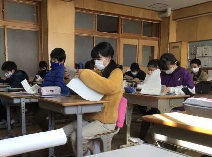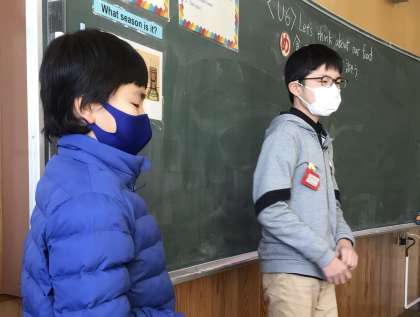 本日の外国語の授業です。内容は、食べ物について英語で話そうです。最初に天気などを英語で確認した後に前回のスピーチの結果発表があり、優秀な班には、ごほうびシールがもらえました。