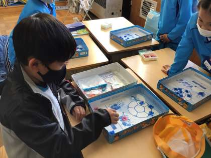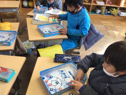 「大きなかず」の学習の様子です。おはじきを弾いて、点取ゲームをしています。自分の合計点を計算することで、二桁の数の計算の仕方を学んでいます。
