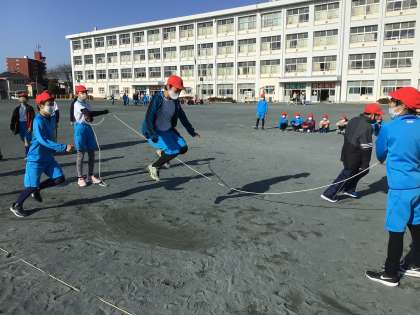 長縄跳びは、各クラス2チームに分けて、2回ずつ3分間で行いました。