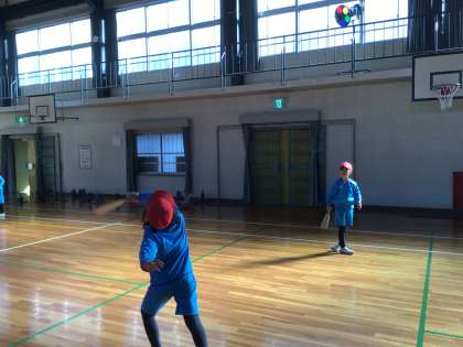 体育館で、はねつきしました。思っていたよりも難しかったようで、なかなか羽がまっすぐ飛ばず、「できな〜い」「とばな〜い」と、悪戦苦闘しました。