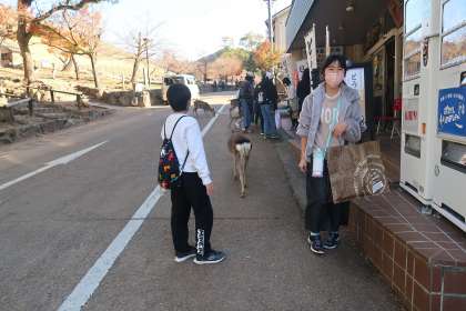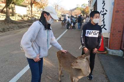 シカをなでたり、シカせんべいをあげたりしていました。写真を撮ってる子もいました。