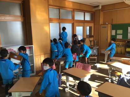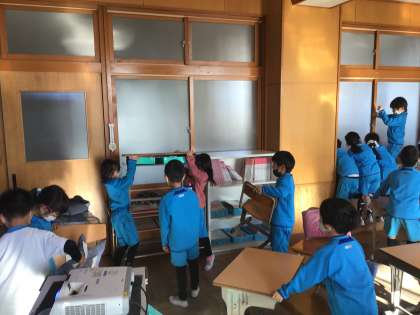 不審者対応の避難訓練を行いました。担任が不在になる教室では、子どもたちだけで教室を施錠して、バリケードを設置する練習をしました。
