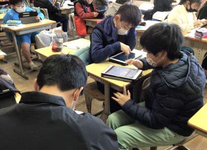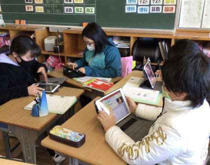 今日の授業では、浄水地区をよくするためのプレゼンテーションの準備を行いました。学習用タブレットを使って資料を集めました。