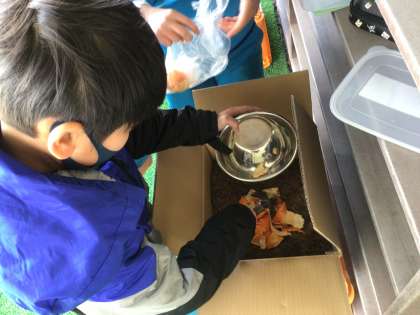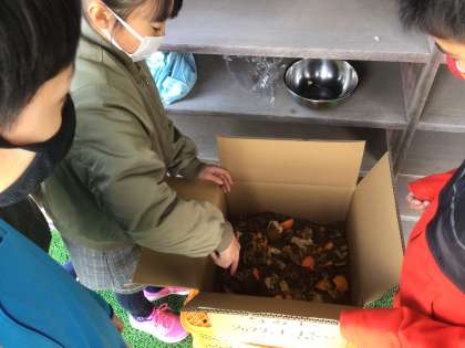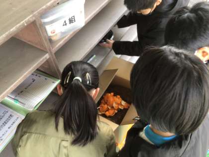 家庭から持ってきた生ごみのほか、給食で食べたみかんの皮を入れました。