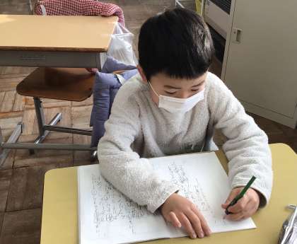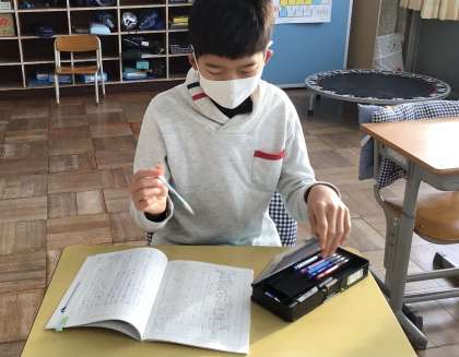 今朝の様子です。連絡帳に翌日の持ち物を書いていました。
