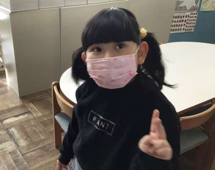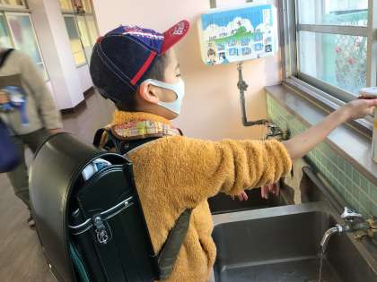 教室に入る前に手を洗っていました。また、カメラを向けるとピースをしてくれました。