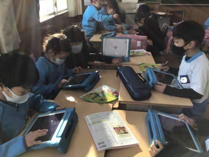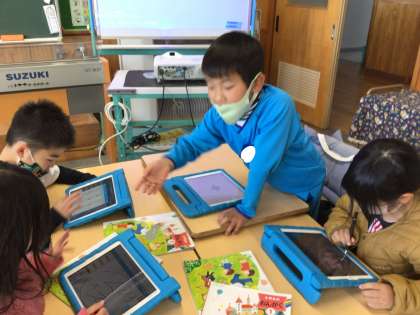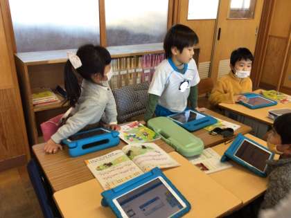 班で話し合って決めた「わらべうた」をiPadで流して、遊んだり、歌ったりしたりしています。話し合いをリードする子も出てきました。成長していますね。
