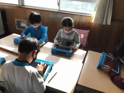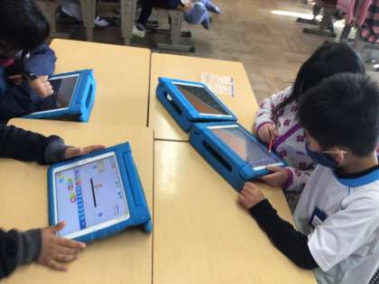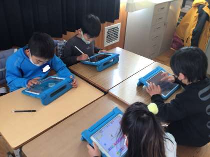 「スクラッチJr.」のアプリを使って、簡単なゲーム作りに挑戦です。キャラクターが障害物に当たったら消えるというプログラミングを元に、班でアイディアを出し合いながら挑戦しています。