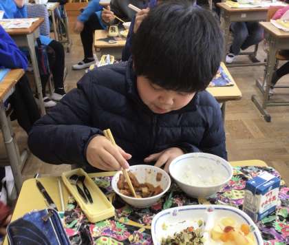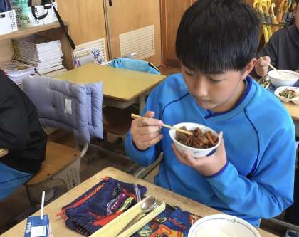 今日のメニューは、ご飯、牛乳、味噌煮込みおでん、小松菜の海苔酢和え、フルーツ和えでした。フルーツ和えが一番人気がありました。