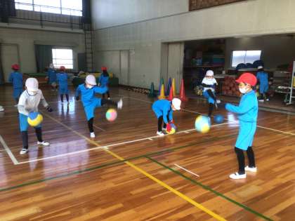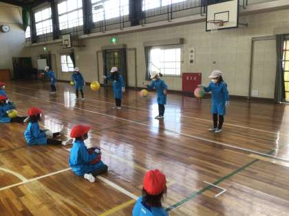 音楽で習った「あんたがたどこさ」の歌に合わせて、ボール遊びをしました。