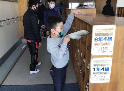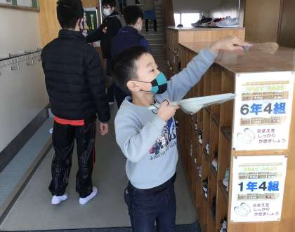 今日の掃除の様子です。東昇降口の掃除です。靴箱の一つ一つをミニほうきで掃いてきれいにしていました。