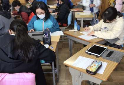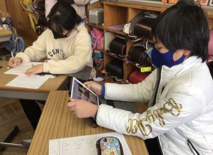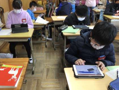 今日は、来週の発表会に向けて、調べ学習を行いました。班ごとに分担を決めて学習用タブレットを使ってまとめていました。