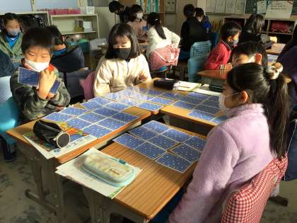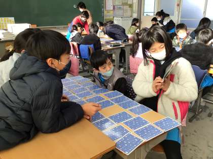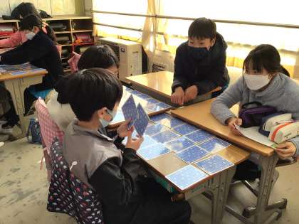 アートカードを使って、マッチングゲームをしました。 カードを2枚めくって、マッチするところを見つけて発表しました。