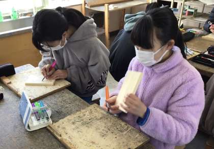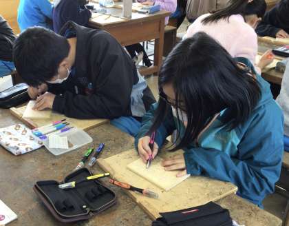 今日は、オルゴールを入れる木の箱の蓋を彫刻刀で彫りました。鉛筆でかいた下書きの絵にそって丁寧に彫刻刀を使っていました。