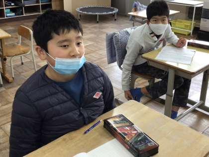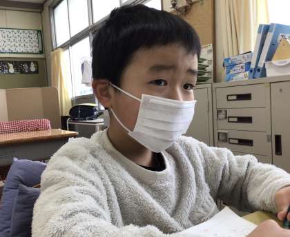 今朝の様子です。連絡帳に記入しているところでした。元気いっぱいでした。