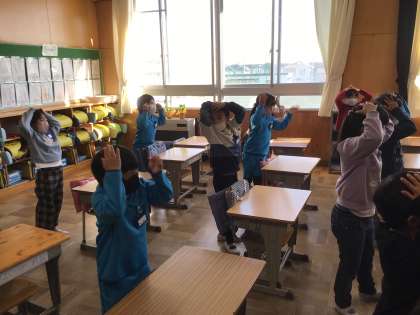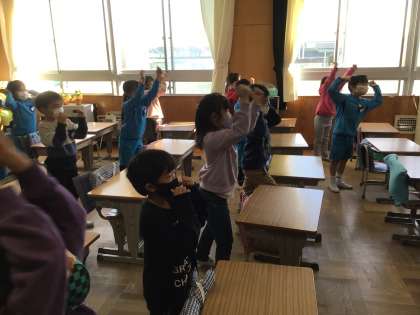 歌に合わせて、頭や肩を触ったり、顔の目や鼻の言い方を覚えたりしました。