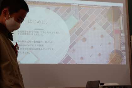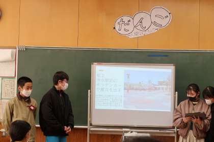 4組、1番目の班の発表です。浄水駅について調べました。さらに浄水駅を発展させるための提案をしていました。