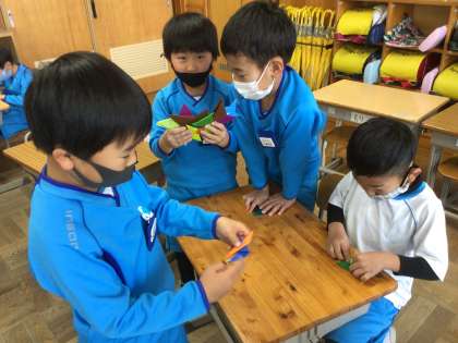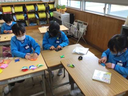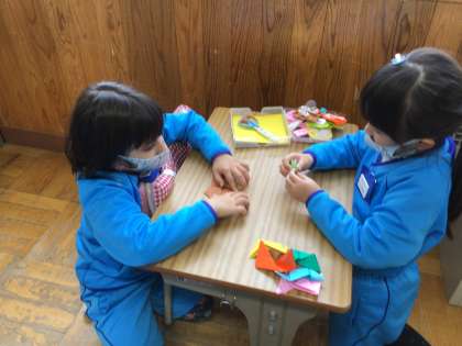 「めざせ、むかしあそびマスター!」の会の、商品や景品を作っています。お友達に、喜んでもらえるように折り紙を折っています。