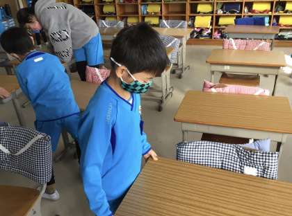 4月の頃は、2人で机を運んでいましたが、今は、1人でも運べるようになりました。