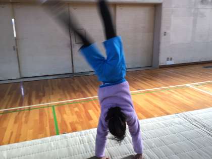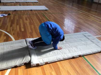 4組の体育の授業です。マット運動の1時間目です。前転、後転などの基本技の練習が中心でしたが、得意な子はロンダードという技を披露していました。