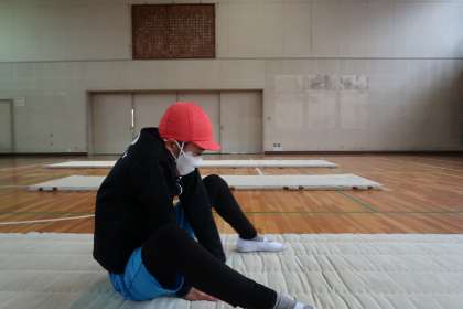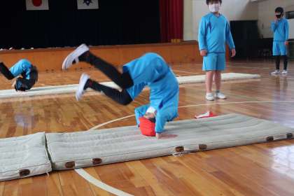 4組の授業です。前転や後転などの回転する技です。