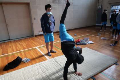 1組の授業です。こちらも倒立する技の披露です。