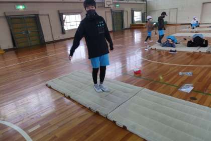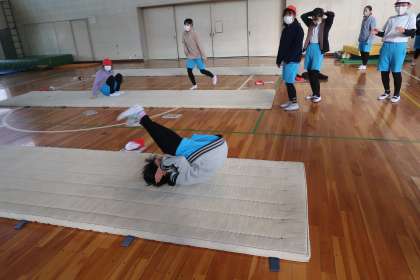 3組の授業です。後転や開脚後転の練習をしています。この3人は、マット運動が得意な子どもたちです。